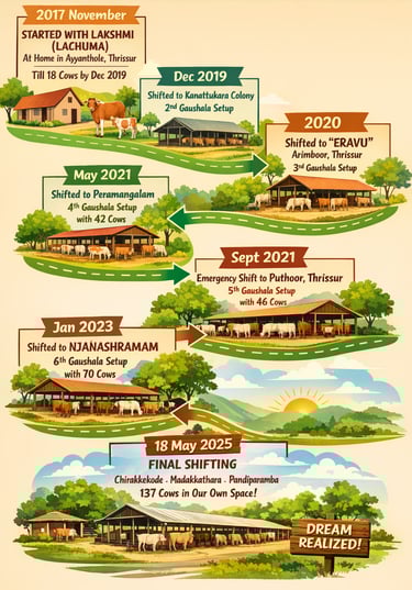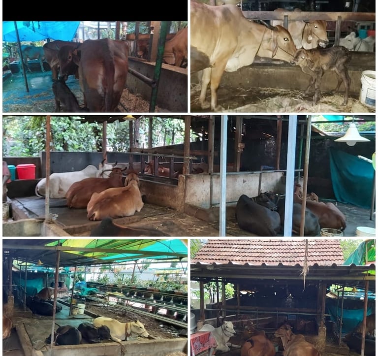 Encouraged by her mother to care for a cow along with her calf for fresh milk, Kalyani’s bond with cows deepened, leading her to learn about the immense value and benefits of Indian indigenous breeds. This journey of love, learning, and devotion inspired her to welcome Gir cows as well. By December 2019, this humble beginning had grown into a nurturing sanctuary for 18 cows, all lovingly cared for at her home in Ayyanthole, Thrissur—laying the foundation for a lifelong mission of gauseva and compassion.