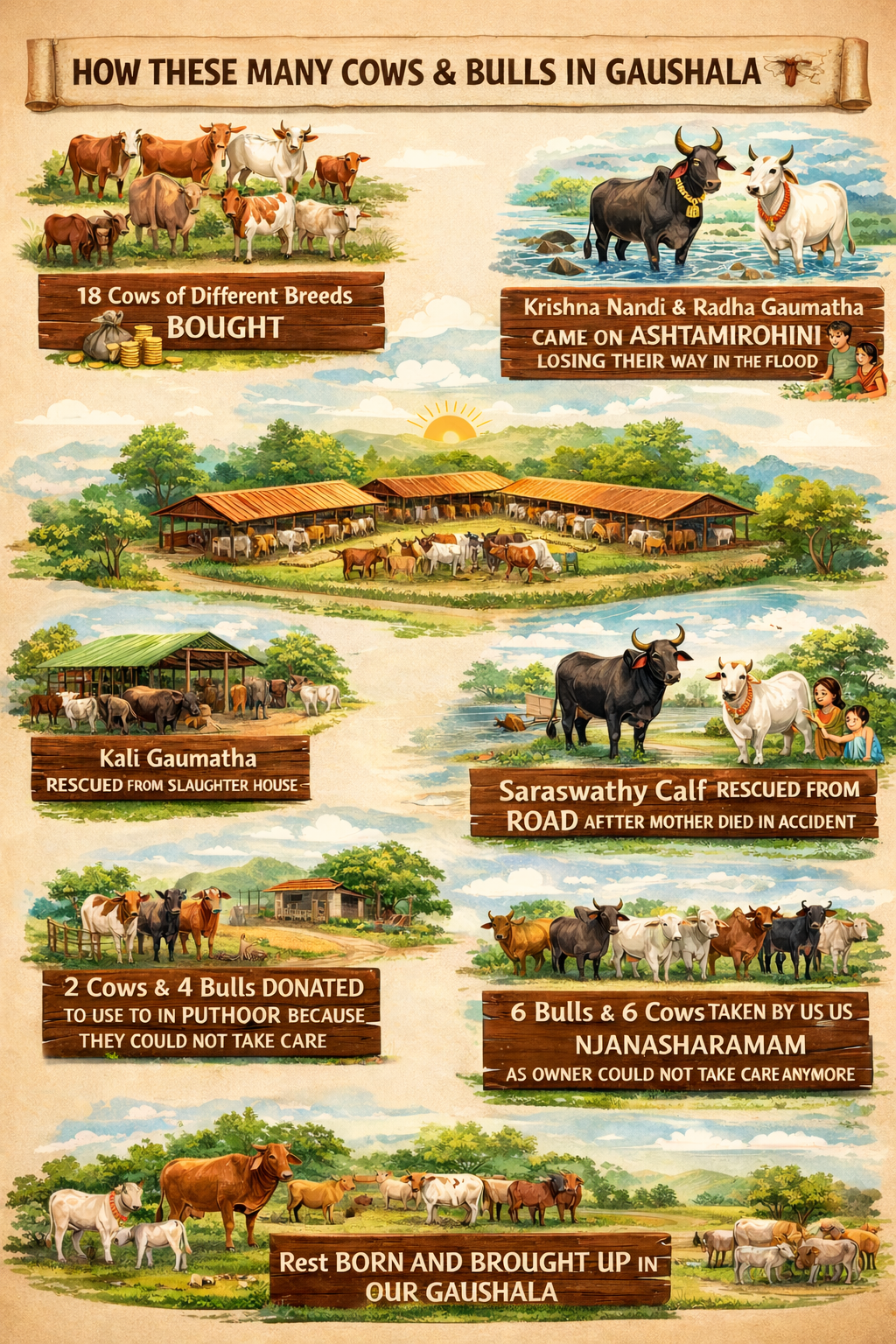 It shows how many of our cows and bulls came into our care through different paths of destiny. Some were bought to protect them, including 18 cows of different breeds. Some, like Krishna Nandi and Radha Gaumatha, arrived during difficult times, finding safety with us. Kali Gaumatha was rescued from a slaughterhouse, and Saraswathy calf was saved after losing her mother in a tragic road accident.Several cows and bulls were donated by families who could no longer care for them, including those from Puthoor and Njanasharamam. Others were brought to us when owners were unable to continue their responsibility.